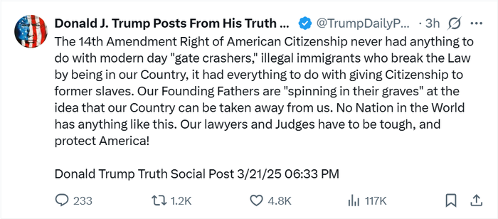 当地时间3月21日,美国总统特朗普在其社交媒体上表示,宪法第十四修正案赋予的美国公民权与非法移民无关,这些人违反法律进入美国。特朗普指出,如果美国的开国元勋得知国家正面临这样的状况,一定会“在坟墓中感到愤怒”。他还称,世界上没有任何一个国家存在这样的情况。特朗普强调,美国的律师和法官必须采取强硬态度,保护国家。