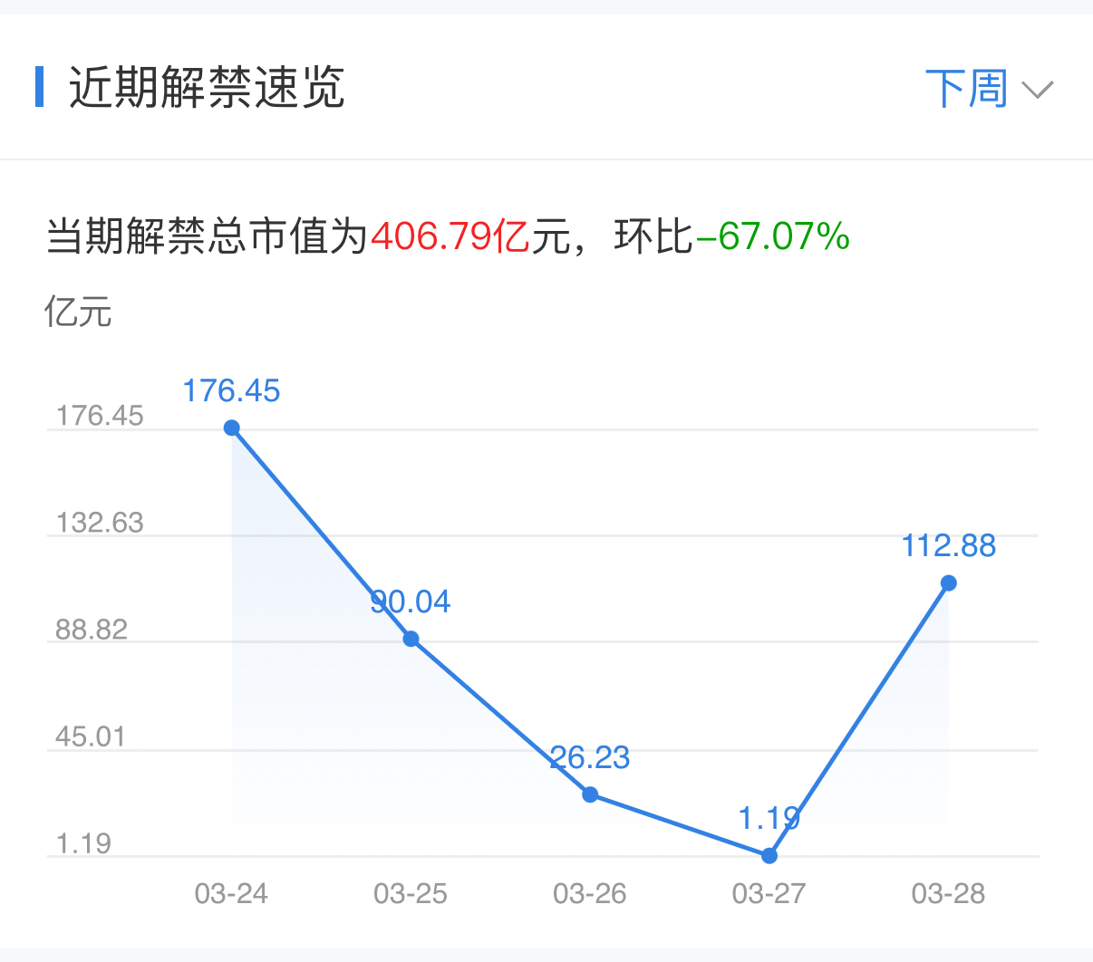 下周(3月24日至3月28日)有55家公司限售股陆续解禁,当期解禁总市值为406.79亿元,环比-67.07%。