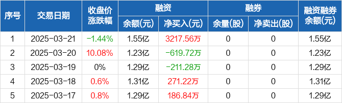 融资方面,当日融资买入7768.68万元,融资偿还4551.11万元,融资净买入3217.56万元,净买入额创历史新高。融券方面,融券卖出0股,融券偿还0股,融券余量0股,融券余额0元。融资融券余额合计1.55亿元。