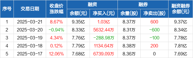 融资方面,当日融资买入6.16亿元,融资偿还5.14亿元,融资净买入1.03亿元。融券方面,融券卖出900股,融券偿还300股,融券余量8.37万股,融券余额162.63万元。融资融券余额合计9.37亿元。