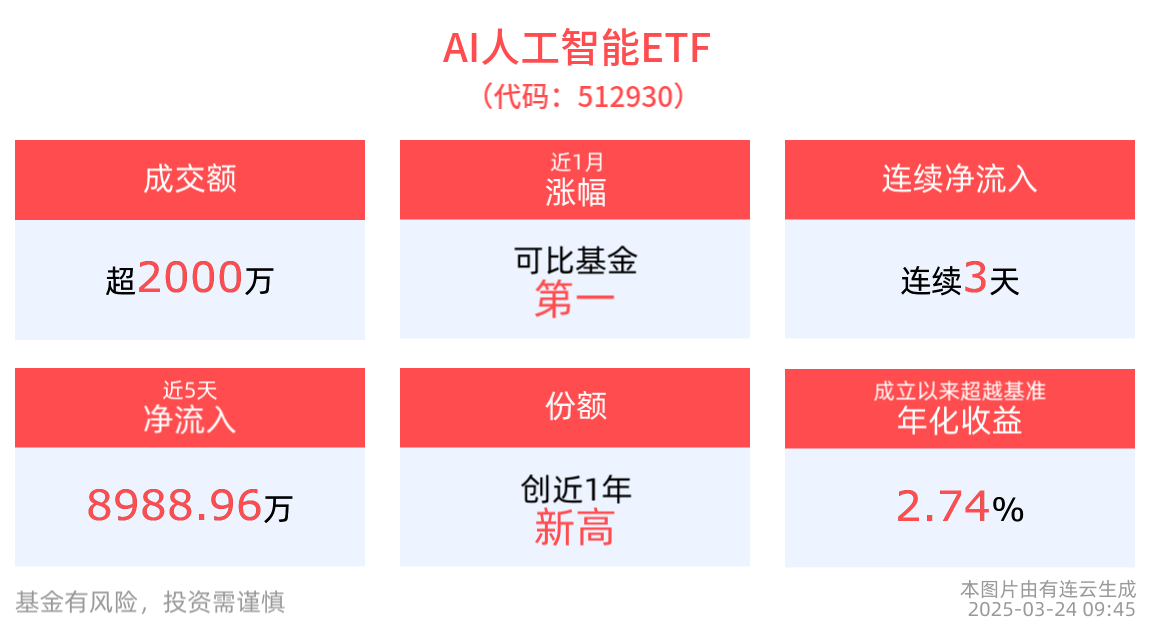 拉长时间看,截至2025年3月21日,AI人工智能ETF近3月累计上涨4.02%,涨幅排名可比基金1/3。消费电子ETF近半年累计上涨44.93%。