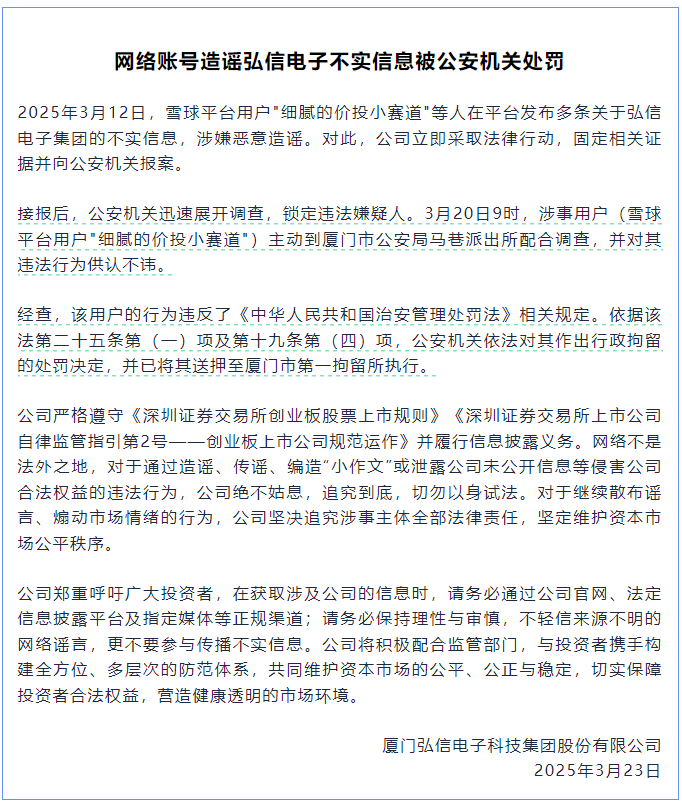 上证报中国证券网讯 3月23日晚,弘信电子在其微信公众号上发布,平台用户捏造并传播与公司有关的不实信息事件有了新进展,3月20日9时,涉事用户(雪球平台用户“细腻的价投小赛道”)主动到厦门市公安局马巷派出所配合调查,被公安机关行政拘留。