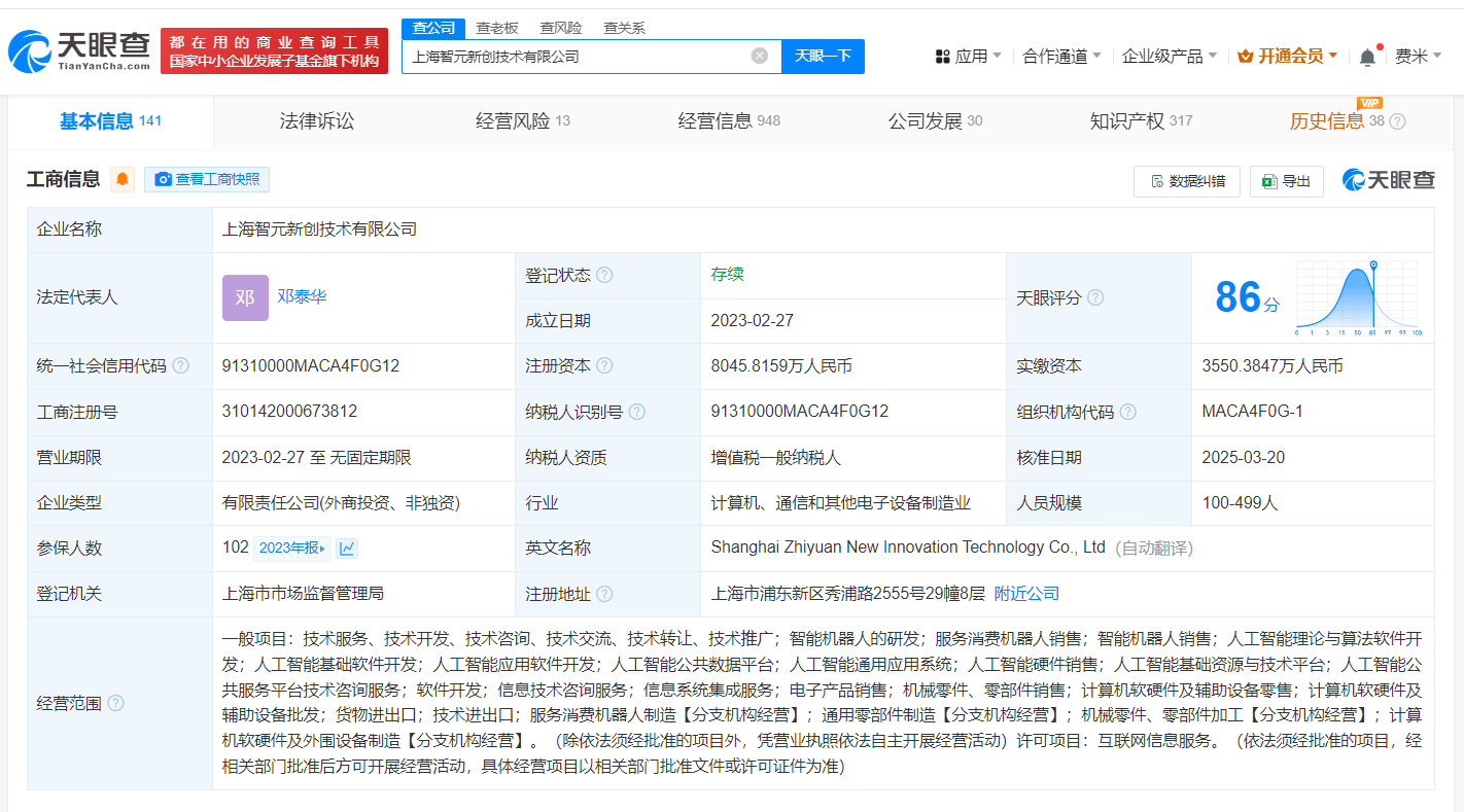 南方财经3月24日电,天眼查App显示,近日,智元机器人关联公司上海智元新创技术有限公司发生工商变更,原股东临港新片区道禾前沿碳中禾(上海)私募投资基金合伙企业(有限合伙)、南京高榕五期一号股权投资合伙企业(有限合伙)等退出,新增广西腾讯创业投资有限公司、卧龙电驱(600580)等为股东;舒远春卸任法定代表人,由邓泰华接任;同时注册资本由约7637万人民币增至约8046万人民币。该公司成立于2023年2月,经营范围包括智能机器人的研发、服务消费机器人销售、人工智能理论与算法软件开发等,现由桑蓬(上海)科技合伙企业(有限合伙)、管鲍(上海)科技合伙企业(有限合伙)等及上述新增股东共同持股。