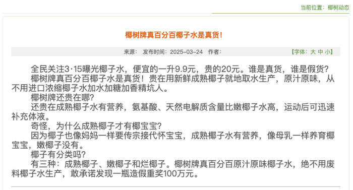 3月24日,椰树集团官网发文称,椰树牌真百分百原汁原味椰子水,绝不用废料椰子水生产,敢承诺发现一瓶造假重奖100万元。