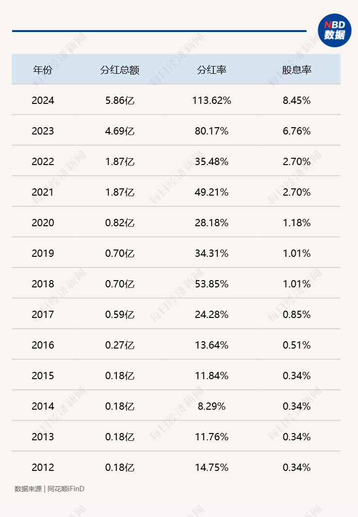 2024年,公司进一步提高分红频次,首次实施中期分红,每股分红0.5元,分红金额1.17亿元;2024年报披露,公司实现营收21.34亿元,同比下降14.08%;实现归母净利润5.16亿元,同比下降11.90%。虽然与2023年度相比业绩有所承压,但公司继续保持高比例分红政策,2024年度每股分红2元,叠加中期分红,该年度累计分红5.86亿元,超过同年度归母净利润数据,分红率高达113.62%,股息率也继续攀升,达到8.45%。