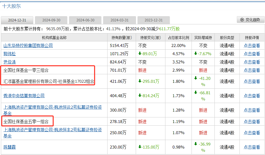 同时,每经资本眼研究员在前十大股东名单中也发现了“耐心资本”的身影——三个社保基金组合,截至2024年末,累计持有华特达因1400.25万股,占公司总股本比例合计5.98%。