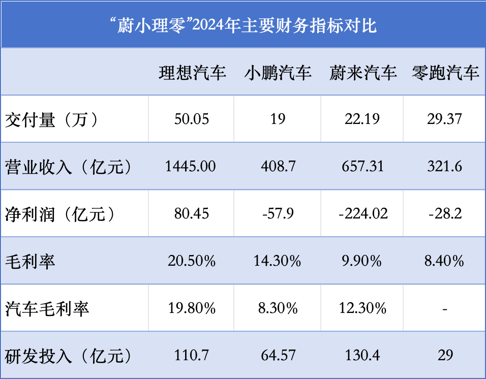 在全年50万辆交付量的强劲带动下,理想汽车2024年营收达1445亿元,同比增长16.6%,这一规模,是蔚来的约2倍,小鹏的3.5倍,甩开小鹏、零跑两家车企千亿的差距。利润上来看,理想仍然是唯一一家实现全年盈利的新势力,但却因2024年上半年的“纯电危机”难逃“增收不增利”的困境,去年全年净利润80.45亿元,同比降31.9%。
