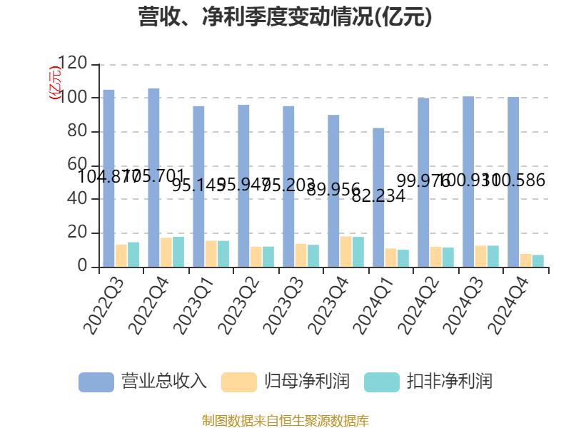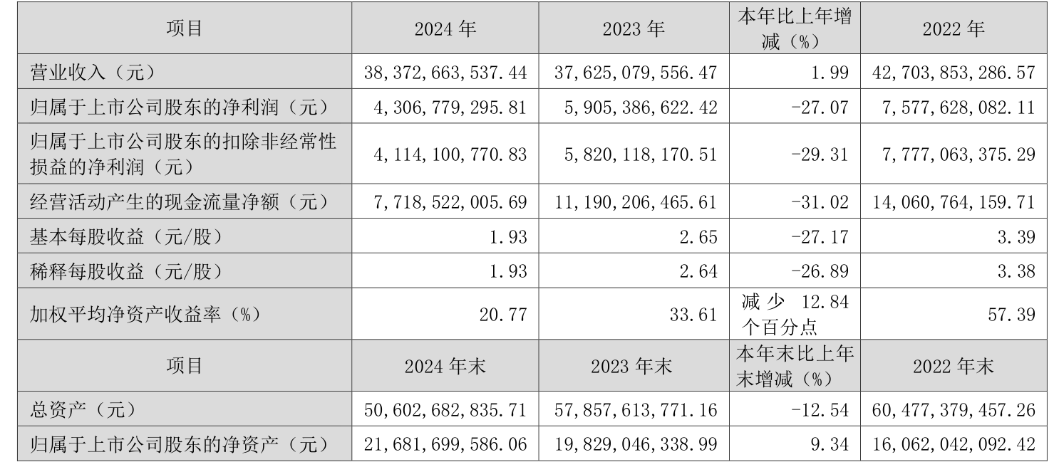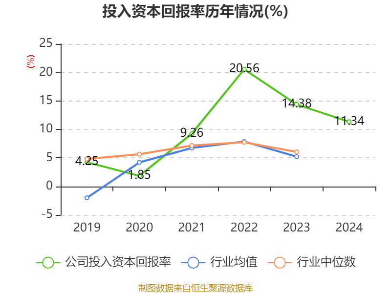 数据显示,2024年公司加权平均净资产收益率为20.77%,较上年同期下降12.84个百分点。公司2024年投入资本回报率为11.34%,较上年同期下降3.04个百分点。