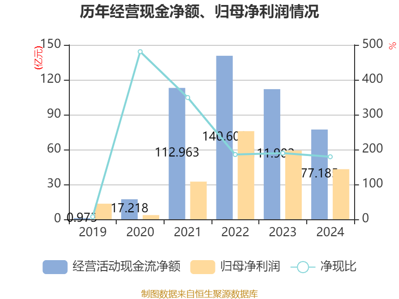 中证智能财讯神火股份(000933)3月25日披露2024年年度报告。2024年,公司实现营业总收入383.73亿元,同比增长1.99%;归母净利润43.07亿元,同比下降27.07%;扣非净利润41.14亿元,同比下降29.31%;经营活动产生的现金流量净额为77.19亿元,同比下降31.02%;报告期内,神火股份基本每股收益为1.93元,加权平均净资产收益率为20.77%。公司2024年度分配预案为:拟向全体股东每10股派现5元(含税)。