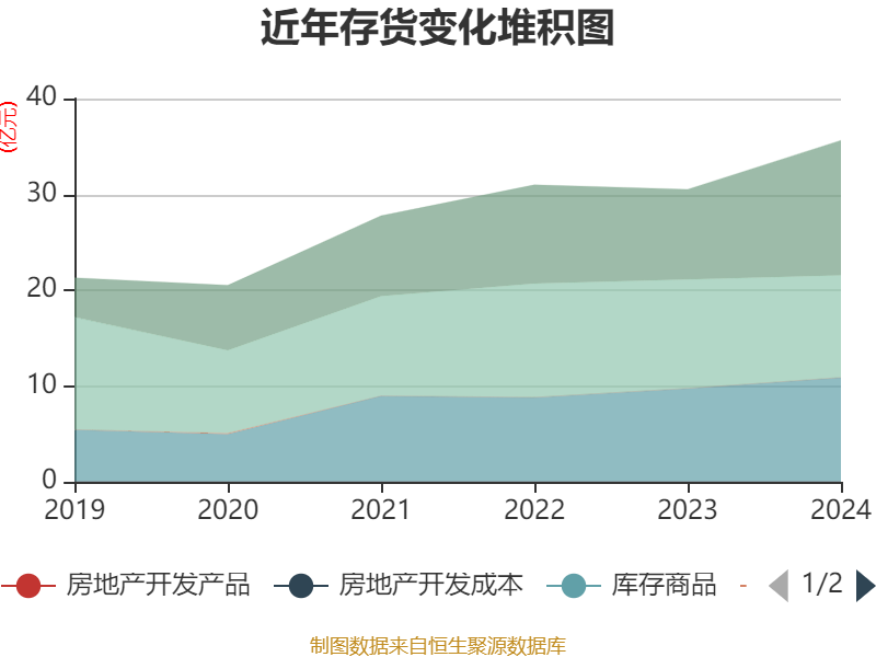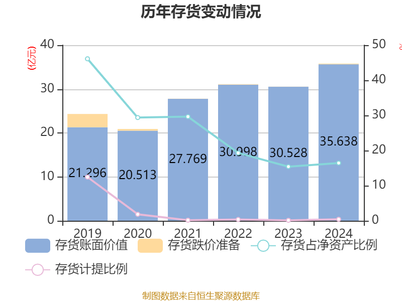 从存货变动来看,截至2024年末,公司存货账面价值为35.64亿元,占净资产的16.44%,较上年末增加5.11亿元。其中,存货跌价准备为1510.1万元,计提比例为0.42%。