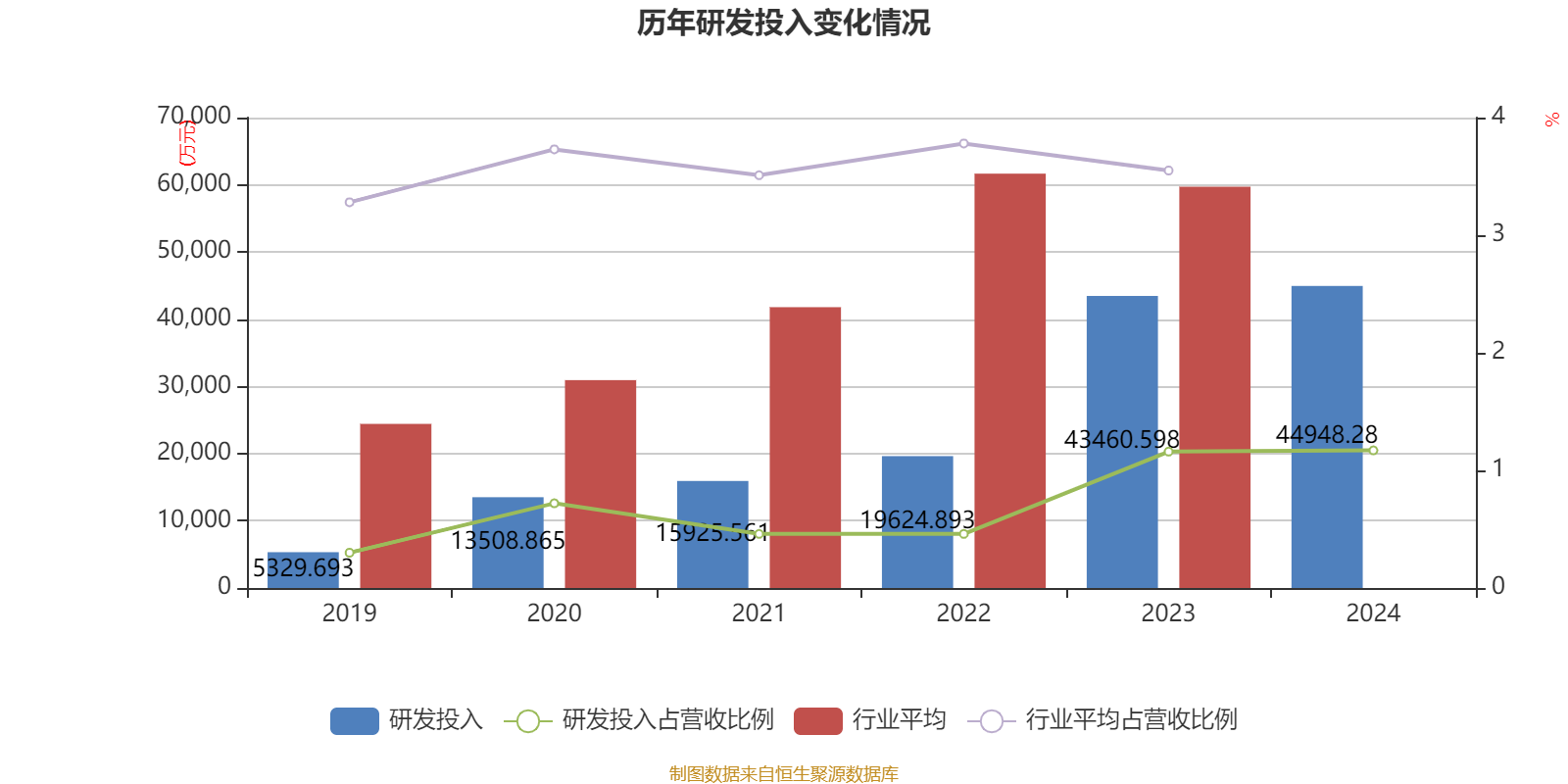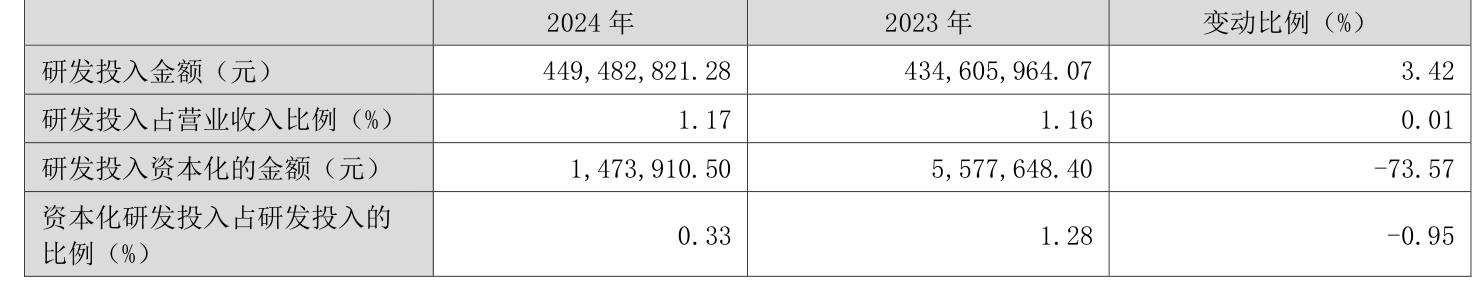 2024年全年,公司研发投入金额为4.49亿元,同比增长3.42%;研发投入占营业收入比例为1.17%,相比上年同期上升0.01个百分点。此外,公司全年研发投入资本化率为0.33%。
