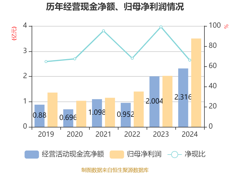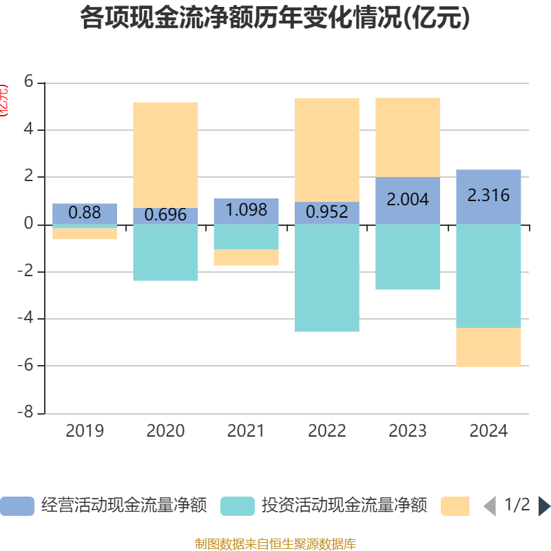 截至2024年,公司经营活动现金流净额为2.32亿元,同比增长15.56%;筹资活动现金流净额-1.66亿元,同比减少5亿元;投资活动现金流净额-4.38亿元,上年同期为-2.76亿元。