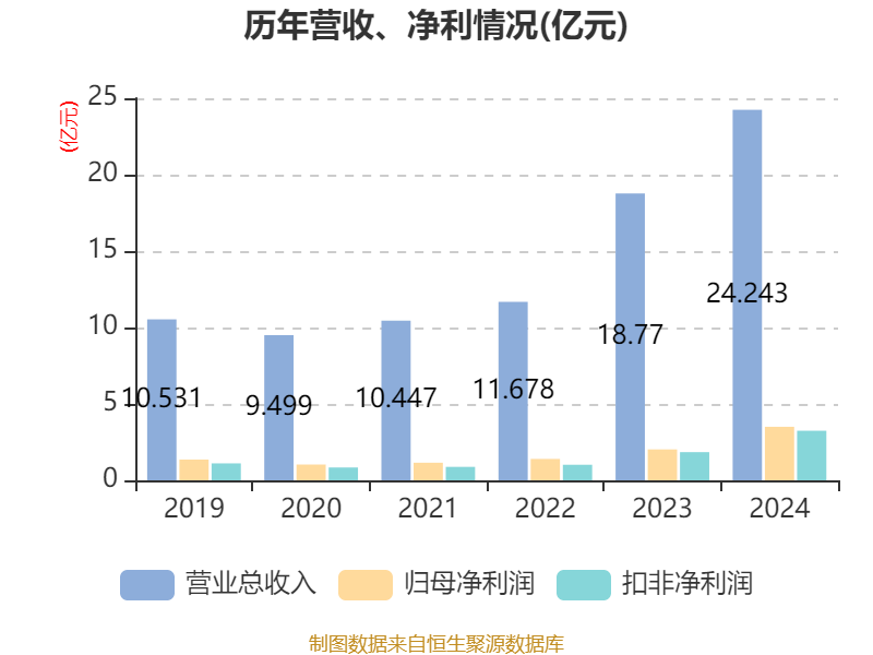 中证智能财讯瑞鹄模具(002997)3月25日披露2024年年度报告。2024年,公司实现营业总收入24.24亿元,同比增长29.16%;归母净利润3.5亿元,同比增长73.20%;扣非净利润3.24亿元,同比增长75.85%;经营活动产生的现金流量净额为2.32亿元,同比增长15.56%;报告期内,瑞鹄模具基本每股收益为1.7元,加权平均净资产收益率为17.74%。公司2024年度分配预案为:拟向全体股东每10股派现3元(含税)。