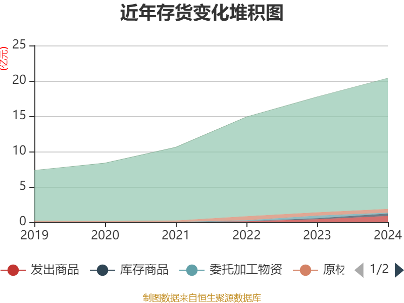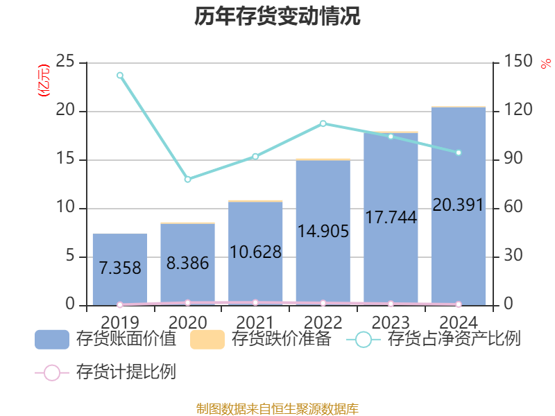 从存货变动来看,截至2024年末,公司存货账面价值为20.39亿元,占净资产的94.22%,较上年末增加2.65亿元。其中,存货跌价准备为921.18万元,计提比例为0.45%。