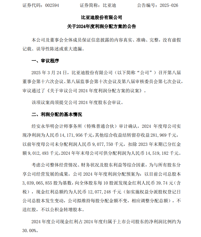 同时,比亚迪宣布,以总股本30.39亿股为基数,公司拟向全体股东每10股派发现金红利39.74元(含税)。