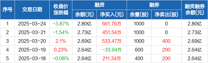 融资方面,当日融资买入2098.28万元,融资偿还1436.52万元,融资净买入661.76万元,连续3日净买入累计1646.77万元。融券方面,融券卖出0股,融券偿还0股,融券余量1000股,融券余额1.29万元。融资融券余额合计2.8亿元。