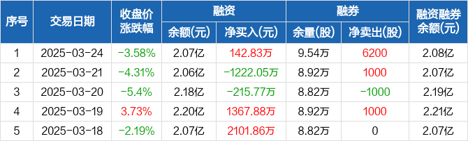 融资方面,当日融资买入2572.48万元,融资偿还2429.65万元,融资净买入142.83万元。融券方面,融券卖出6200股,融券偿还0股,融券余量9.54万股,融券余额69.45万元。融资融券余额合计2.08亿元。