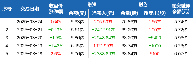 融资方面,当日融资买入4235.2万元,融资偿还4029.7万元,融资净买入205.5万元。融券方面,融券卖出2.21万股,融券偿还5500股,融券余量70.86万股,融券余额1120.3万元。融资融券余额合计5.74亿元。