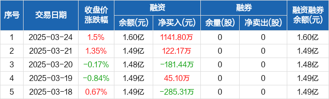融资方面,当日融资买入2685.94万元,融资偿还1544.13万元,融资净买入1141.8万元。融券方面,融券卖出0股,融券偿还0股,融券余量0股,融券余额0元。融资融券余额合计1.6亿元。
