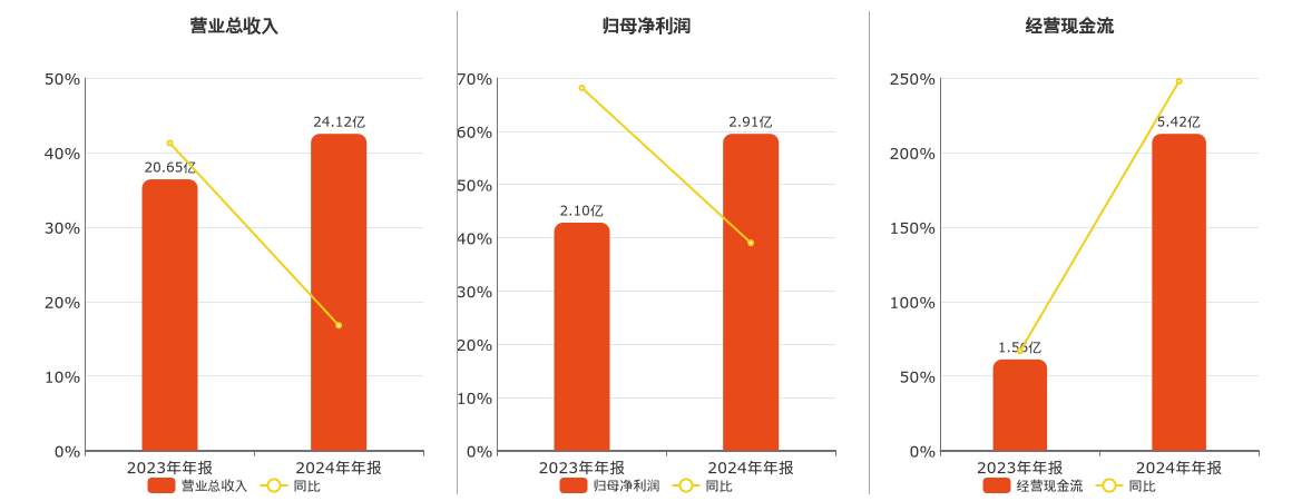 公司营业总收入为24.12亿元。归母净利润为2.91亿元。经营活动现金净流入为5.42亿元。