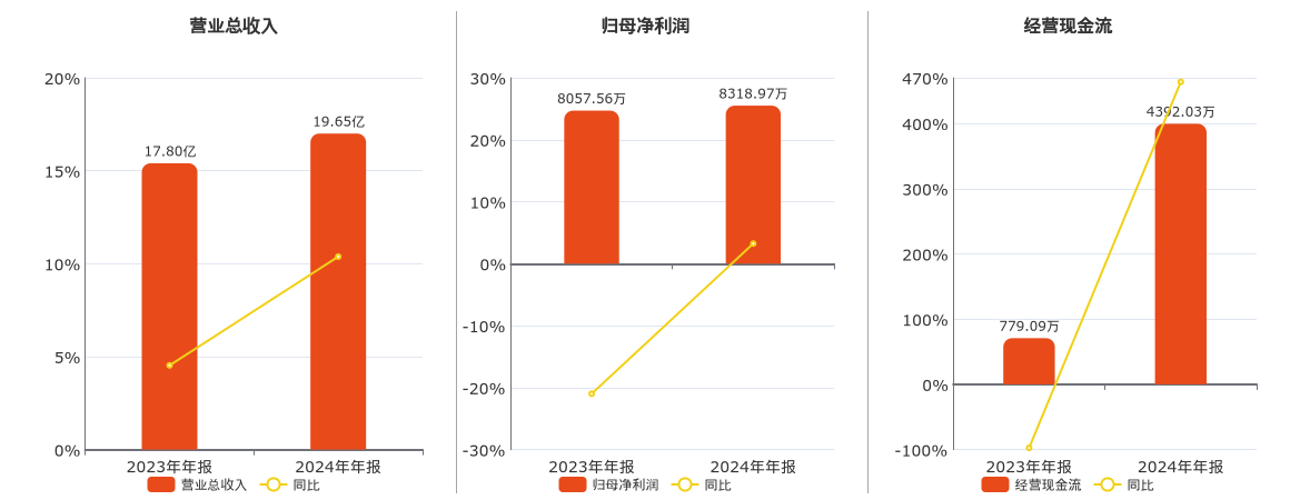 公司营业总收入为19.65亿元。归母净利润为8318.97万元。经营活动现金净流入为4392.03万元。