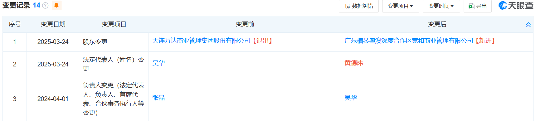 3月25日,南财快讯记者从天眼查获悉,近日,徐州万达广场有限公司发生工商变更,大连万达商业管理集团股份有限公司退出股东,新增广东横琴粤澳深度合作区宽和商业管理有限公司为全资股东,同时法定代表人等发生变更。