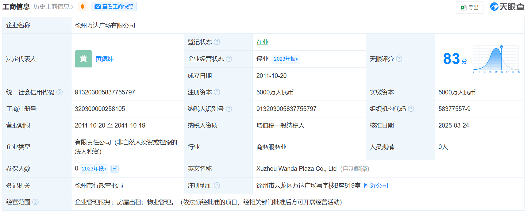 天眼查信息显示,徐州万达广场有限公司成立于2011年,经营范围包含:企业管理服务;房屋出租;物业管理。