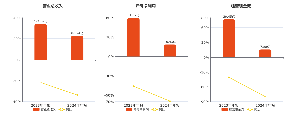 公司营业总收入为80.74亿元,较去年同报告期营业总收入减少41.15亿元,同比较去年同期下降33.76%。归母净利润为10.43亿元,较去年同报告期归母净利润减少23.63亿元,同比较去年同期下降69.37%。经营活动现金净流入为7.88亿元,较去年同报告期经营活动现金净流入减少31.57亿元,同比较去年同期下降80.02%。