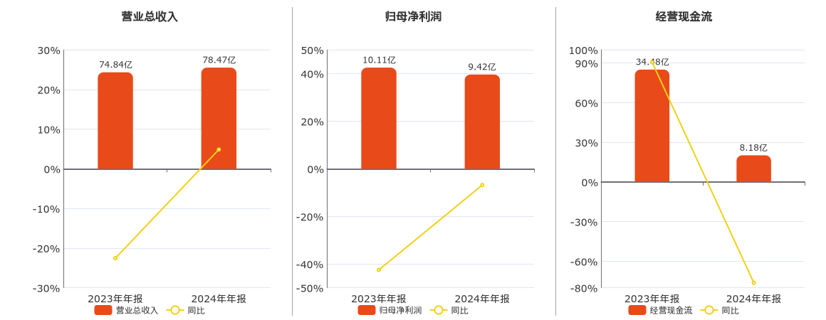 公司营业总收入为78.47亿元。归母净利润为9.42亿元,较去年同报告期归母净利润减少6901.42万元,同比较去年同期下降6.83%。经营活动现金净流入为8.18亿元,较去年同报告期经营活动现金净流入减少26.29亿元,同比较去年同期下降76.26%。
