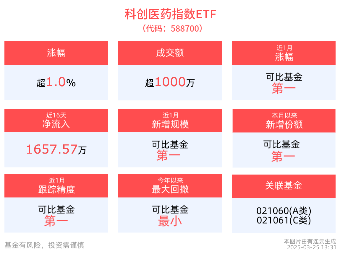 截至2025年3月25日 13:31,上证科创板生物医药指数强势上涨1.10%,成分股智翔金泰上涨6.70%,诺唯赞上涨5.75%,奕瑞科技上涨4.28%,东方生物、华大智造等个股跟涨。科创医药指数ETF(588700)上涨1.10%,盘中成交额已达1492.32万元,换手率4.14%。