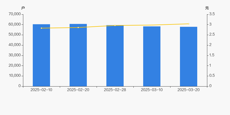自2025年2月20日以来,公司股东户数连续3期下降,截至目前减幅为4.61%。2025年2月20日至2025年3月20日区间股价上涨6.29%。