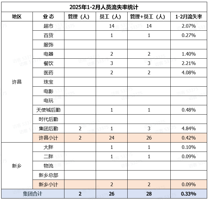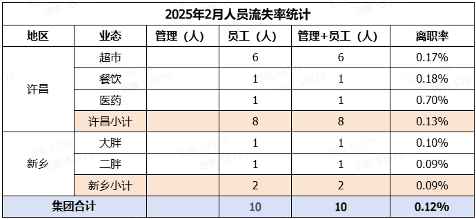 统计数据显示,2025年2月胖东来在许昌和新乡两地共流失员工10人,其中许昌流失8人,新乡流失2人,集团合计离职率为0.12%;管理人员未有流失。今年前两个月,许昌和新乡两地共流失28人,其中包括管理人员2人。