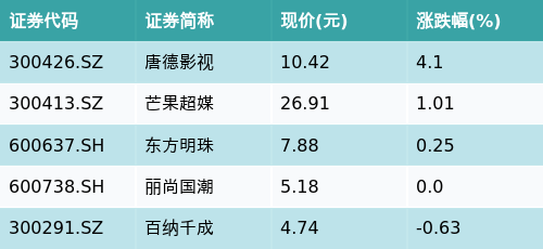 截至收盘,短剧主题涨跌幅最高的五只股票为:唐德影视(300426.SZ)、芒果超媒(300413.SZ)、东方明珠(600637.SH)、丽尚国潮(600738.SH)与百纳千成(300291.SZ)。详情见下表: