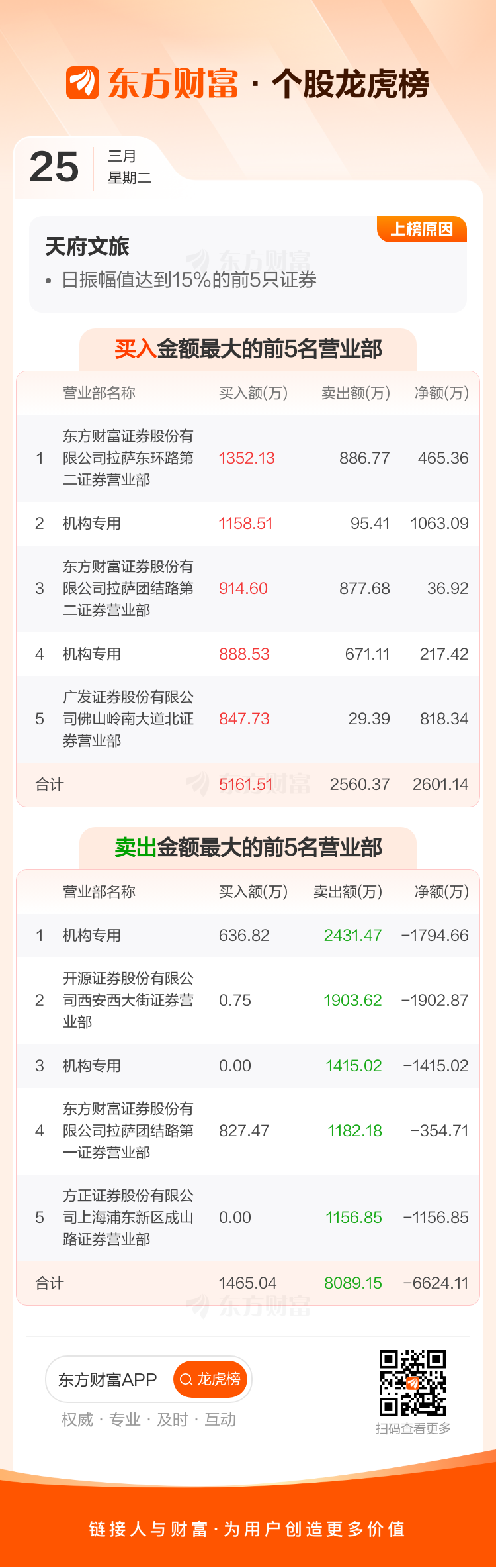 交易所2025年3月25日公布的交易公开信息显示,天府文旅因成为日振幅值达到15%的前5只证券上榜。天府文旅当日收报3.83元,涨跌幅1.86%,偏离值17.00%,换手率19.74%,成交额9.47亿。
