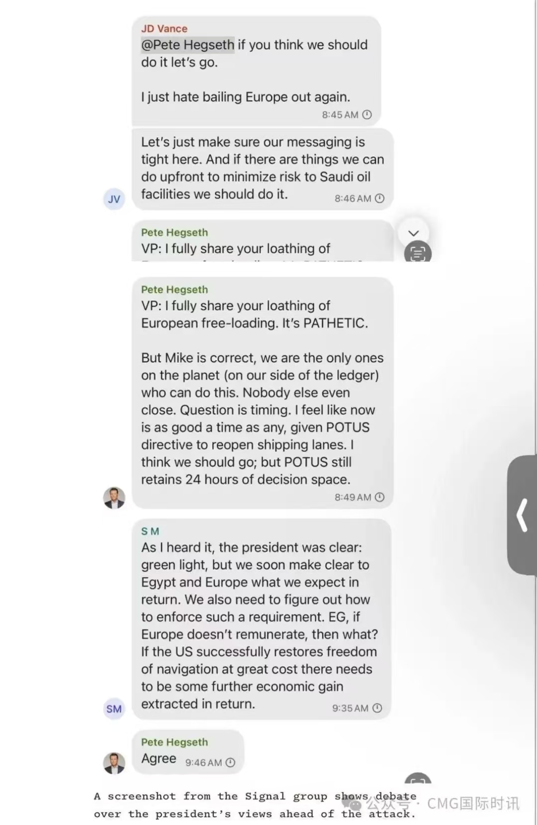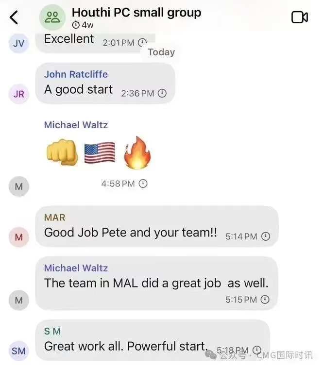 2天后,也就是美东时间3月13日,戈德伯格收到通知,他已被纳入一个名为“胡塞PC小组”的聊天群。