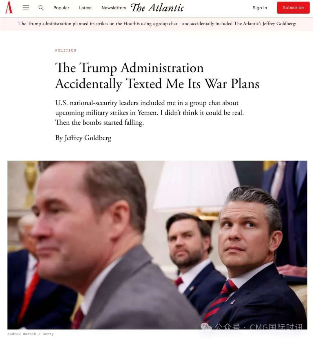 据央视新闻消息,美国《大西洋》月刊总编辑杰弗里·戈德伯格3月24日表示,近期他被美国国家安全高层官员拉入美军打击也门胡塞武装作战计划涉密群聊。