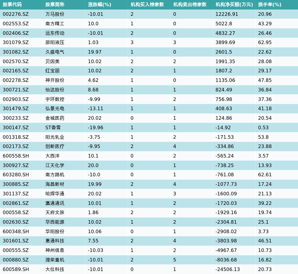 南方财经3月25日电,南财金融终端数据显示,因当日异动登上龙虎榜的个股中,28只沪深A股龙虎榜出现了机构的身影,机构合计净卖出19808.44万元,具体来看,机构净买入12只个股,净卖出16只个股。其中,机构净买入前三分别为万马股份(002276.SZ)、南方精工(002553.SZ)与远东传动(002406.SZ),详情见下图: