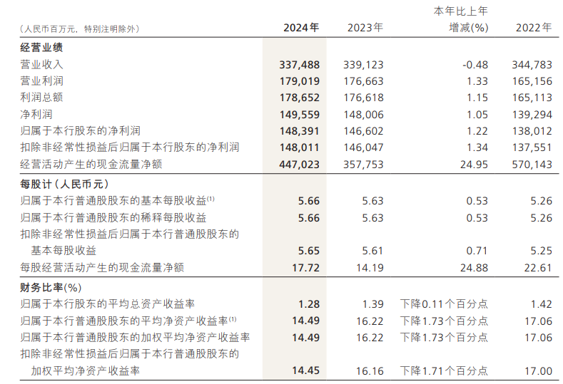 2024年,招商银行实现营业收入3374.88亿元,同比下降0.48% ;实现归母净利润1483.91亿元,同比增长1.22% ;实现净利息收入2112.77亿元,同比下降1.58% ;实现非利息净收入1262.11亿元,同比增长1.41%。