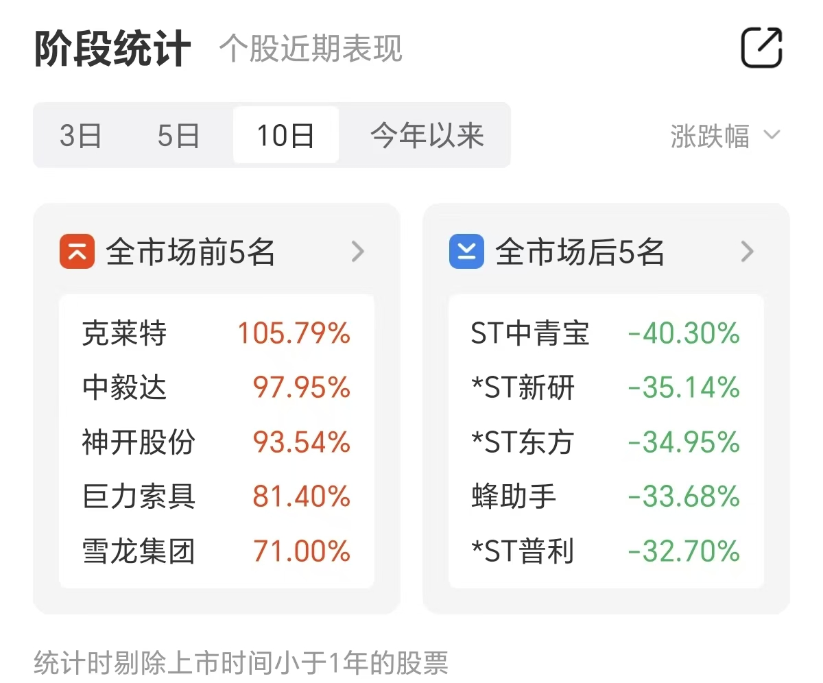 与此同时,近十个交易日涨幅前四名的个股分别为克莱特、中毅达、神开股份、巨力索具、雪龙集团。