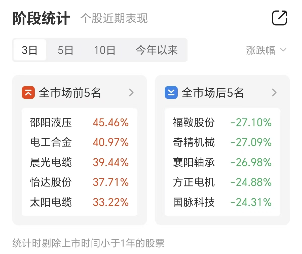 3月25日市场全天震荡调整,A股全市场涨幅前五名分别为邵阳液压、电工合金、晨光电缆、怡达股份、太阳电缆,其中邵阳液压三日涨幅达45.46%,位列涨幅榜第一。