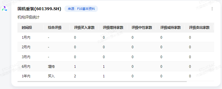 截至最近的评级数据,国机重装在近1月内、近2月内和近3月内均未有机构给出评级。然而,在近6月内,国机重装获得了“增持”评级,共有2家机构参与评级,其中1家给出买入评级,1家给出增持评级。在近1年内,国机重装的综合评级为“买入”,共有3家机构参与评级,其中2家给出买入评级,1家给出增持评级。