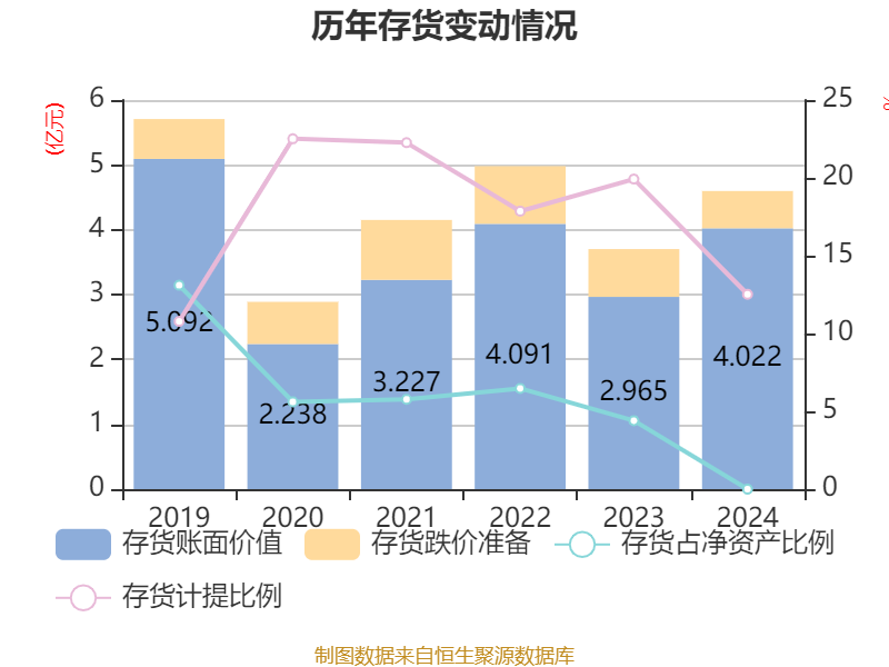 从存货变动来看,截至2024年末,公司存货账面价值为4.02亿元,占净资产的0%,较上年末增加1.06亿元。其中,存货跌价准备为5754.04万元,计提比例为12.52%。