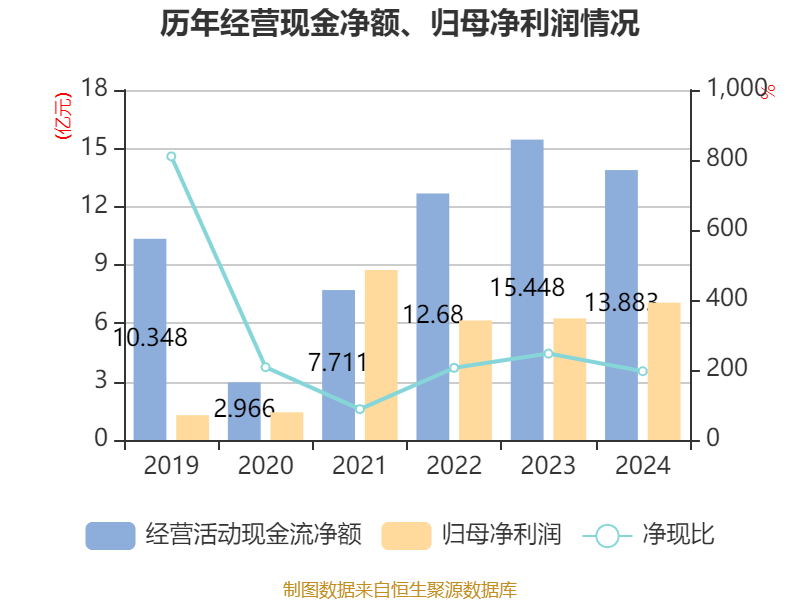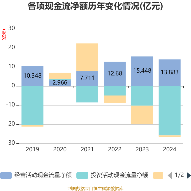 截至2024年,公司经营活动现金流净额为13.88亿元,同比下降10.13%;筹资活动现金流净额-8889.83万元,同比增加8.76亿元;投资活动现金流净额-25.91亿元,上年同期为-10.3亿元。