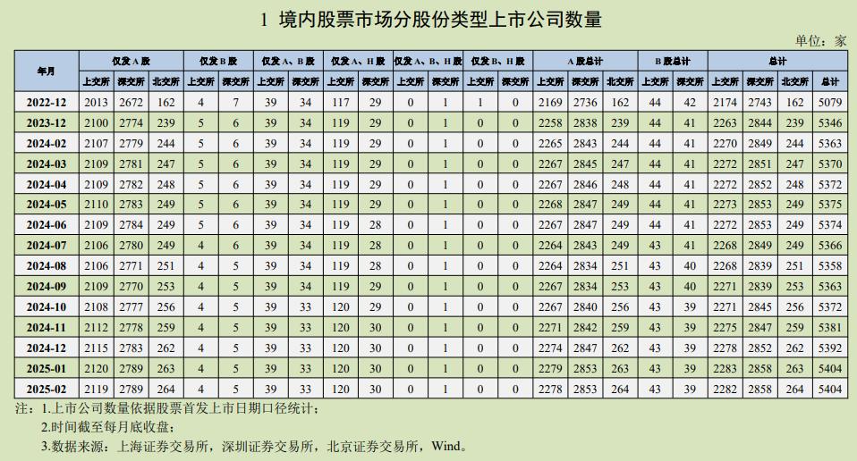 中国上市公司协会3月25日发布的2月统计月报显示,截至2025年2月28日,境内股票市场共有上市公司5404家,沪、深、北证券交易所分别为2282、2858、264家。以2月收盘价计算,上市公司境内股份总市值87.11万亿元,为2022年以来各月末最高点。