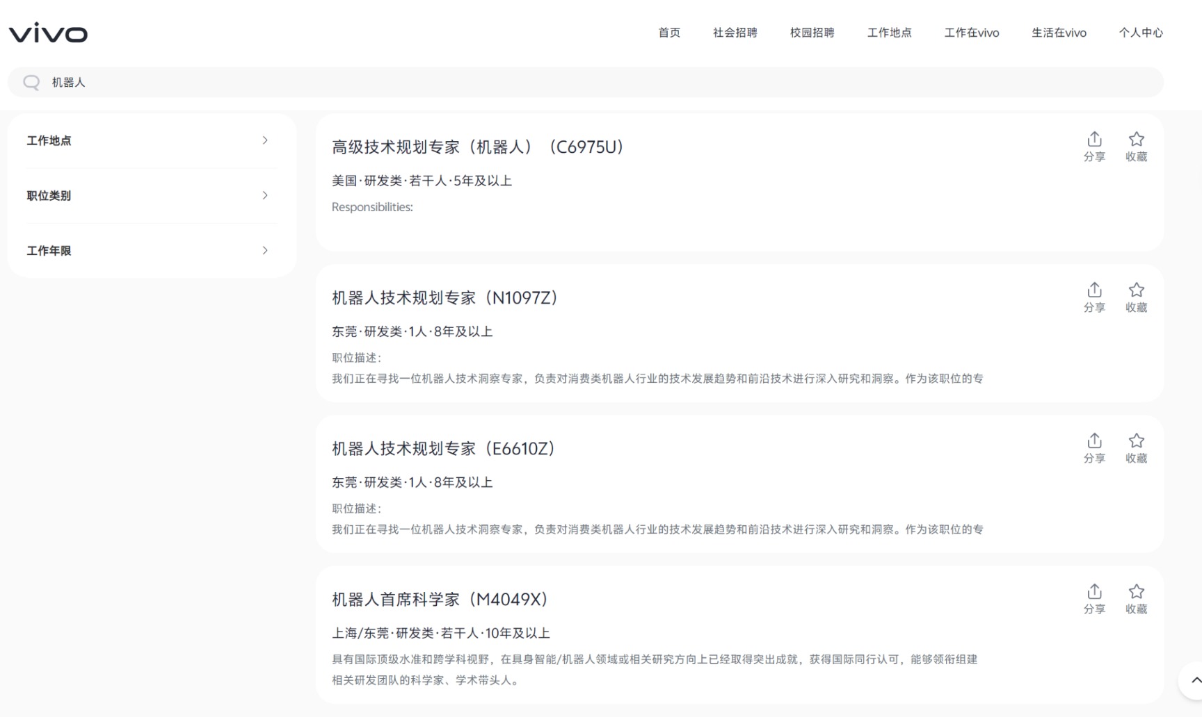 记者留意到,目前,vivo官网已开始招聘机器人相关领域的技术专家,职位包括机器人首席科学家、机器人技术规划专家等,工作地点涵盖上海、东莞、美国等地。