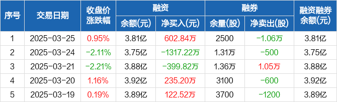 融资方面,当日融资买入2454.32万元,融资偿还1851.48万元,融资净买入602.84万元。融券方面,融券卖出0股,融券偿还1.06万股,融券余量2500股,融券余额5.04万元。融资融券余额合计3.81亿元。