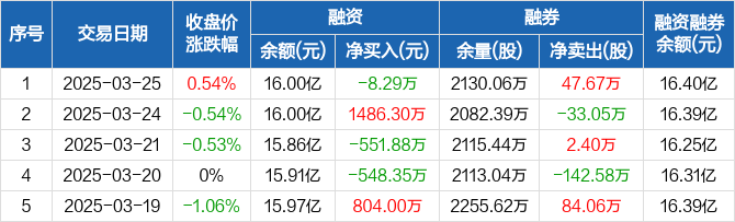 融资方面,当日融资买入1.49亿元,融资偿还1.49亿元,融资净偿还8.29万元。融券方面,融券卖出53.63万股,融券偿还5.96万股,融券余量2130.06万股,融券余额3961.9万元。融资融券余额合计16.4亿元。