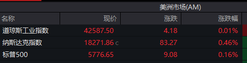 当地时间周二,美国三大股指小幅收涨,道琼斯工业指数涨0.01%,报42587.5点,标准普尔500指数涨0.16%,报5776.65点,纳斯达克综合指数涨0.46%,报18271.86点。