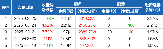 融资方面,当日融资买入6375.53万元,融资偿还5065万元,融资净买入1310.52万元,连续5日净买入累计7677.09万元。融券方面,融券卖出0股,融券偿还0股,融券余量0股,融券余额0元。融资融券余额合计2.34亿元。