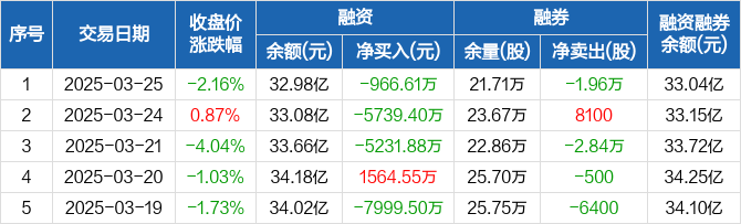 融资方面,当日融资买入1.1亿元,融资偿还1.2亿元,融资净偿还966.61万元,连续3日净偿还累计1.19亿元。融券方面,融券卖出8000股,融券偿还2.76万股,融券余量21.71万股,融券余额589.86万元。融资融券余额合计33.04亿元。